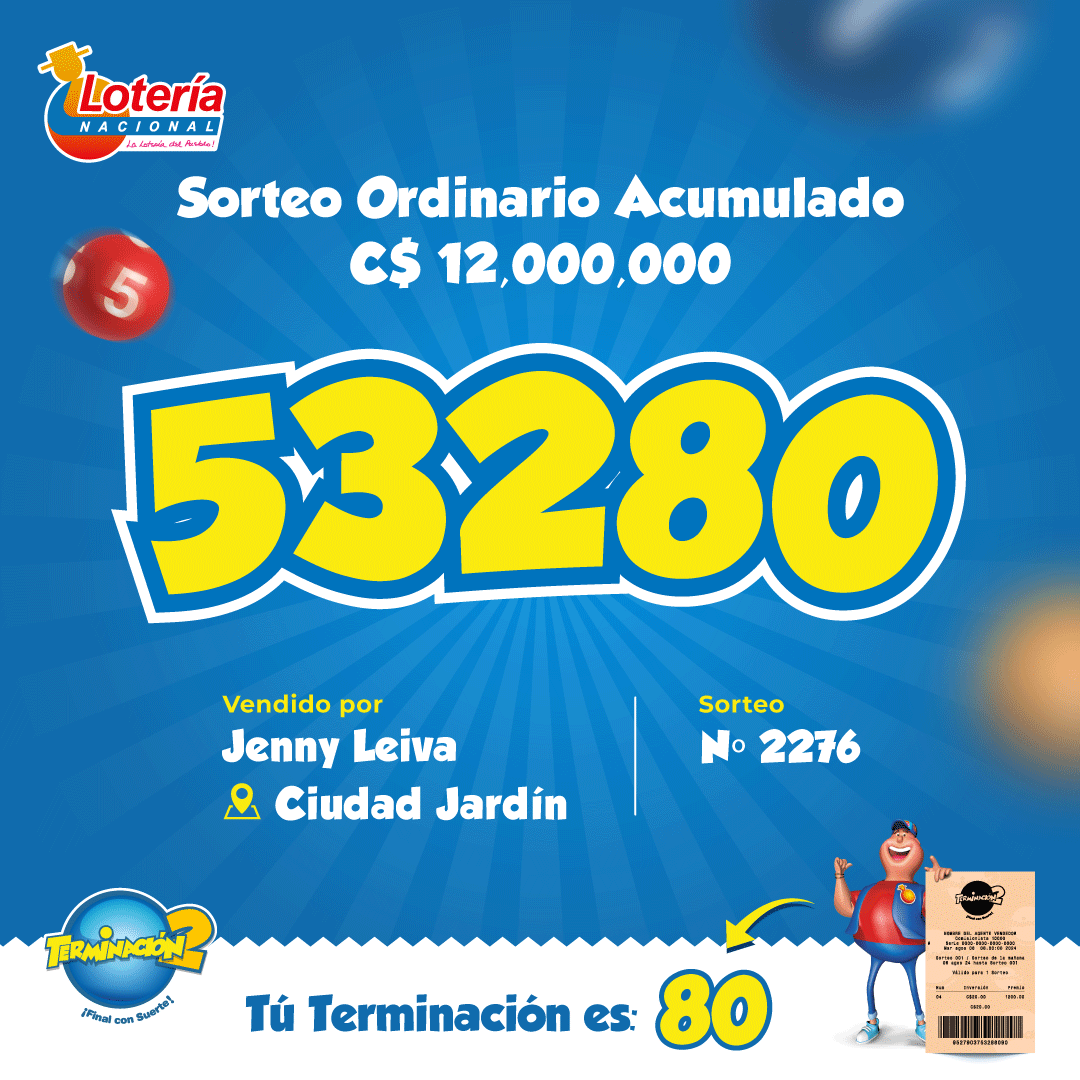 Lotería Nacional informa que el Sorteo Ordinario Acumulado N°2276, verificado el día Martes 21 de abril de 2026, cuyo Premio Mayor fue de 12 millones de córdobas, favoreció al billete número 53280, vendido en la sucursal de Ciudad Jardín, por la concesionaria Jenny Leiva Martínez, código Y-209.