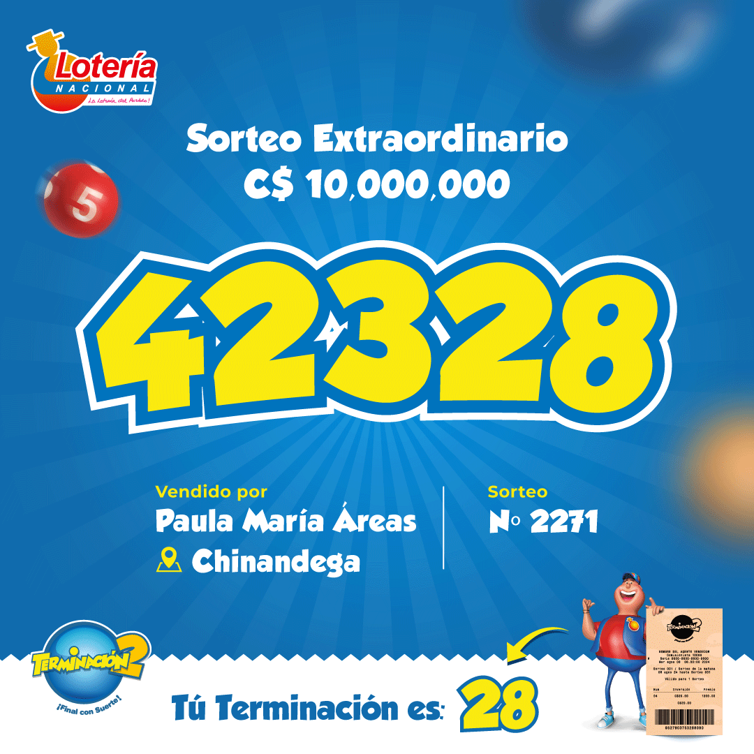 Lotería Nacional informa que el Sorteo Extraordinario N°2271, verificado el día Martes 17 de marzo de 2026, cuyo Premio Mayor fue de 10 millones de córdobas, favoreció al billete número 42328, vendido en la Sucursal de Chinandega por la concesionaria Paula María Áreas, código C-006.