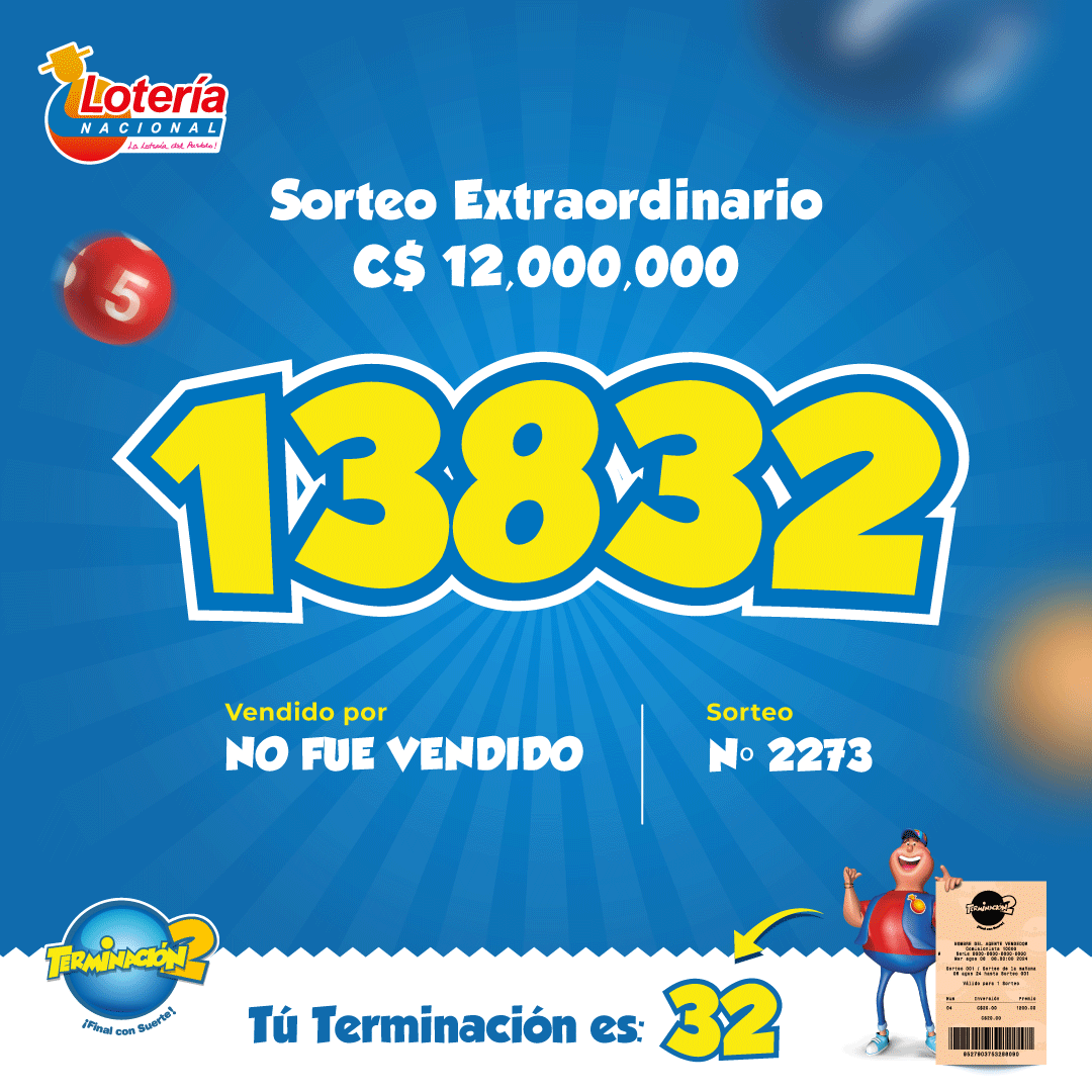 Lotería Nacional informa que el Sorteo Extraordinario N°2273, verificado el día Martes 31 de marzo de 2026, cuyo Premio Mayor fue de 12 millones de córdobas, favoreció al billete número 13832, No fue vendido.