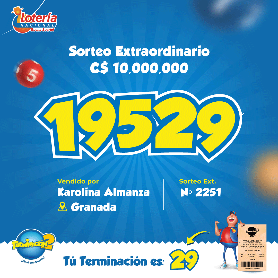 Lotería Nacional informa que el Sorteo Extraordinario N°2251, verificado el día Martes 21 de octubre de 2025, cuyo Premio Mayor fue de 10 millones de córdobas, favoreció al billete número 19529, vendido en la Sucursal de Granada por la concesionaria Karolina Almanza López, código G-748.