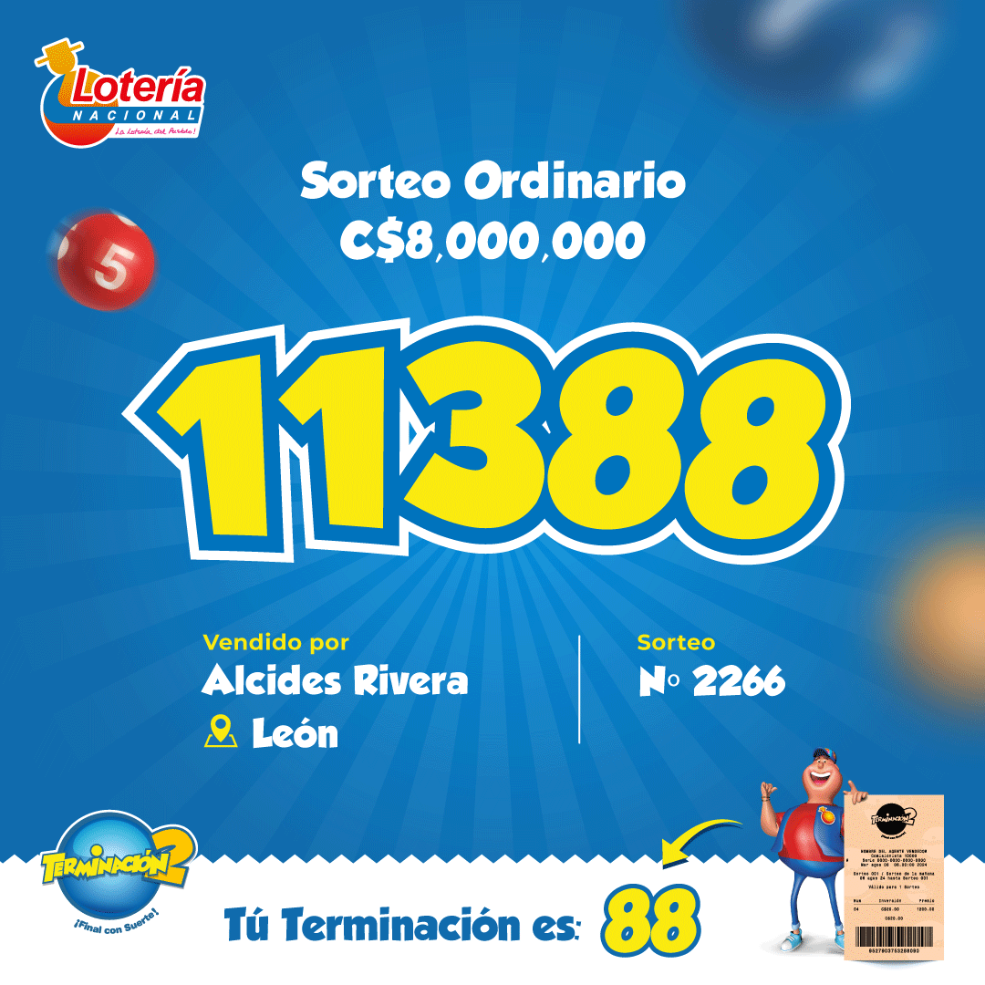 Lotería Nacional informa que el Sorteo Ordinario N°2266, verificado el día Martes 10 de febrero de 2026, cuyo Premio Mayor fue de 8 millones de córdobas, favoreció al billete número 11388, vendido en la Sucursal de León por el concesionario Alcides Rivera García, código L-529.