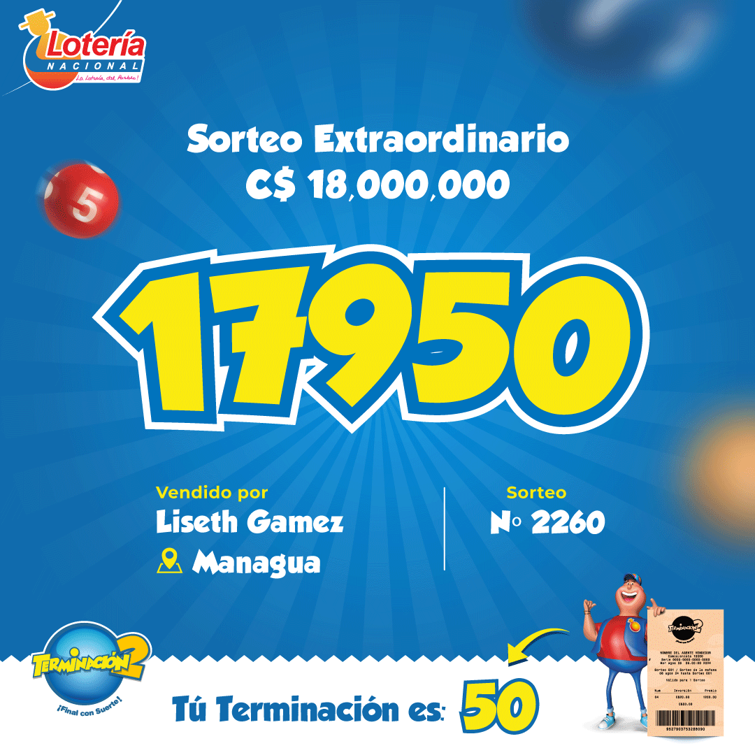 Lotería Nacional informa que el Sorteo Extraordinario N°2260, verificado el día Martes 30 de diciembre de 2025, cuyo Premio Mayor fue de 18 millones de córdobas, favoreció al billete número 17950, vendido en la Sucursal de Managua por la concesionaria Lizette Gámez Betanco, código E-814.